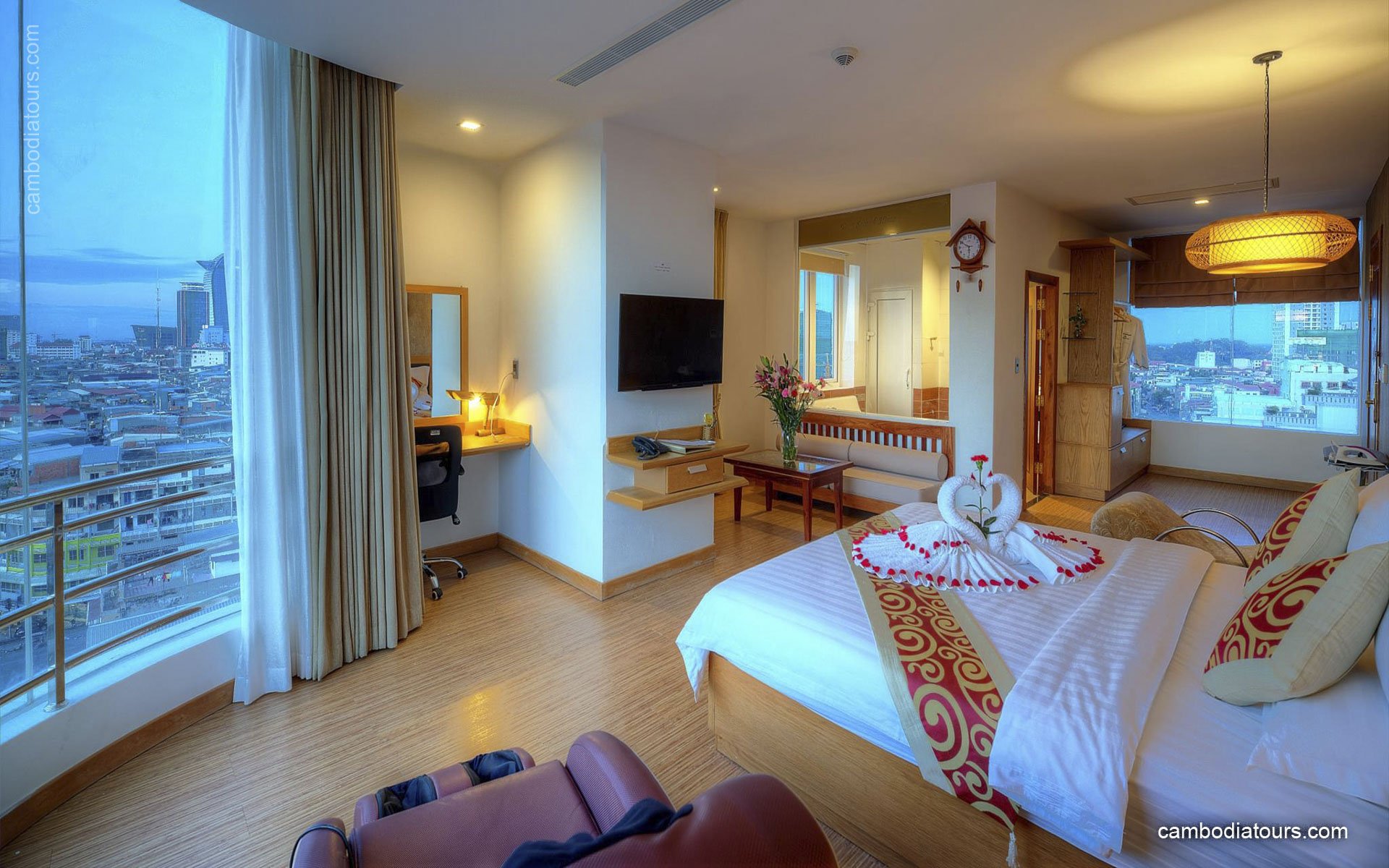 Your dream of Phnom Penh’s most spacious room. The Deluxe Room welcomes you with plush, and furnishings and abundant natural light from floor-to-ceiling and huge curve mirror window. Choose the Deluxe Room with City View option to stay on the corner rooms and experience magnificent views of Phnom Penh's city-skyline. This luxuriously decorated room features a flat-screen satellite channels, minibar, wardrobe and safe box. The bathroom with hot & cool shower and difference decoration.