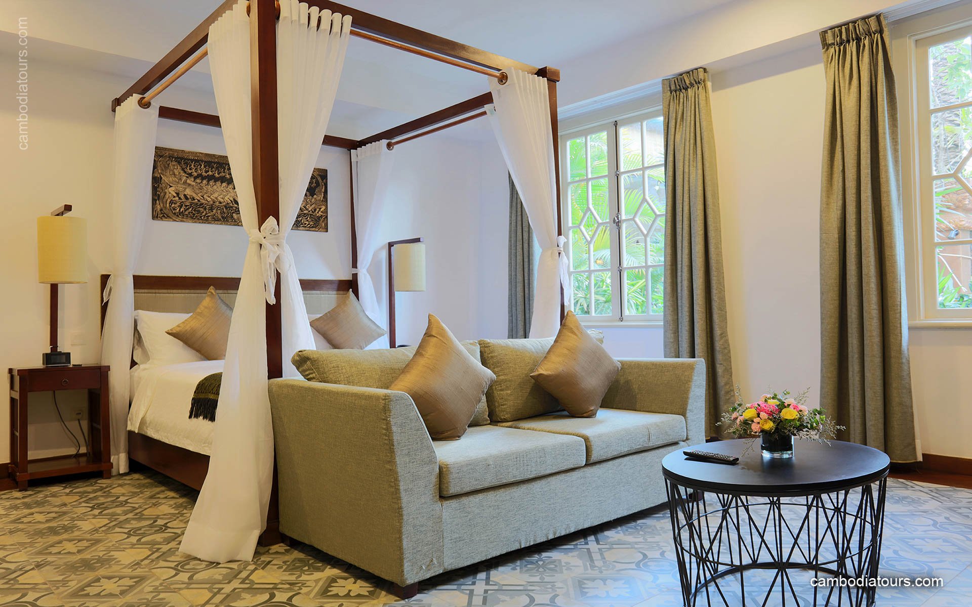 Apsara Suite: Located in Building B, the Apsara Deluxe and Suite range in size from 32 Sqm to 43 Sqm. Carefully decorated in Angkorian style with tasteful interior design to reflect the country’s history and traditions. With a comfortable king sized bed, the Apsara Deluxe and Suite are your ideal respite from the hot and busy city.