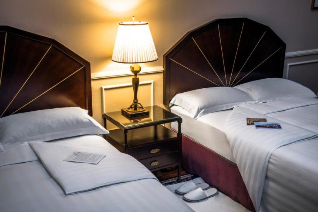Two double beds, in 1929 historic building, high ceiling, wooden floor, original claw-foot bath, shower, free business WIFI, Butler Svc, quiet room pool view, 366 Sq ft /34 m²