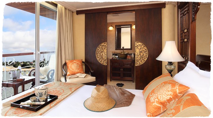The JAYAVARMAN Signature Suite is a 27sqm large cabin including a 3sqm balcony. This Signature cabin is dedicated to the Khmer culture. The most stunning facility is the solid-wood and king-size four-poster bed with an impressive olive coloured gypsum artwork at the bed-head displaying an Apsara dancer.