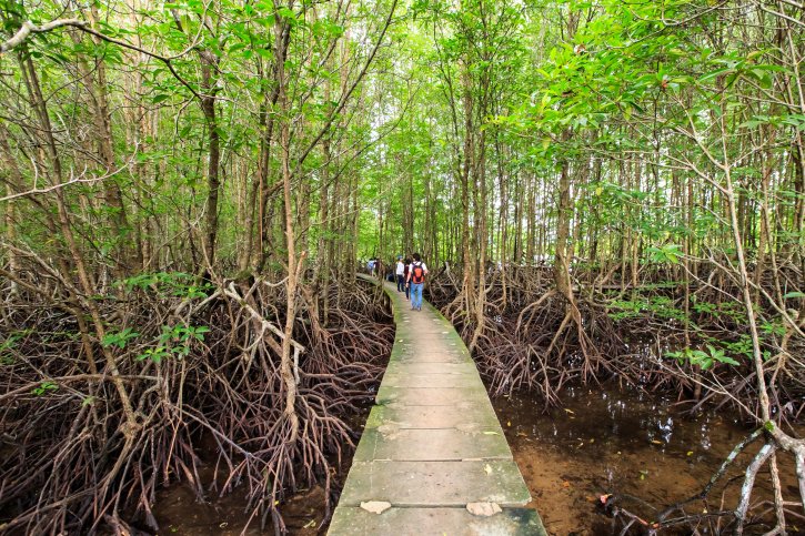 Peam Krasaop Wildlife Sanctuary located in southwestern Cambodia. The area is known for its mangroves and numerous islands separated by a maze of bays and channels. Peam Krasaop Wildlife Sanctuary consists of 23,750 hectares and has around 10,000 people living within its borders. The main gateway to Peam Krasaop Wildlife Sanctuary is the settlement of Boeng Kayak (Bankayak), where the local community has built a one-kilometer mangrove walk that consists of a series of elevated walkways, a suspension bridge and a 15-metre observation tower offering fantastic bird-spotting opportunities, or hire a boat to explore its myriad of canals and small villages.