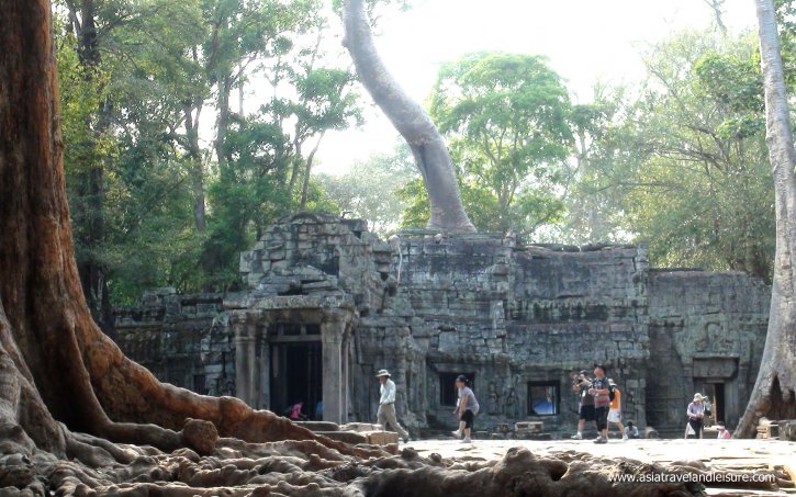 Ta Prohm is among the largest of the monuments in the Angkor complex. The complex included 260 statues of gods, 39 towers with pinnacles and 566 groups of residences. Ta Prohm comprises a series of long low buildings standing on one level, which are enclosed by rectangular laterite wall (600 by 1,000 meters, 1,959 by 3,281 feet). Only traces of the wall are still visible. The center of the monument is reached by a series of towers connected with passages. Ta Prohm is the undisputed capital of the kingdom of the Trees. It has been left untouched by archaeologists except for the clearing of a path for visitors and structural strengthening to stave of further deterioration.