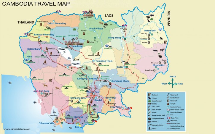 The Cambodia Kingdom (ព្រះរាជាណាចក្រកម្ពុជា ឬ ប្រទេសកម្ពុជា) (sometimes transliterated as Kampuchea to more closely represent the Khmer pronunciation) is a Southeast Asian nation bordered by Vietnam to the East, Laos to the North, Thailand to the Northwest, and the Gulf of Thailand to the Southwest.